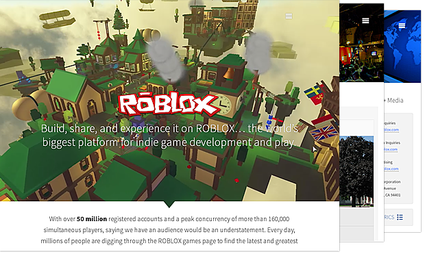 Corporate site for Roblox : A comprehensive game development / publishing platform with 55 million hours of engagement time per month and 15 million games created by users.